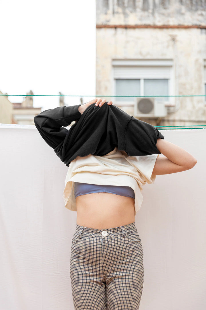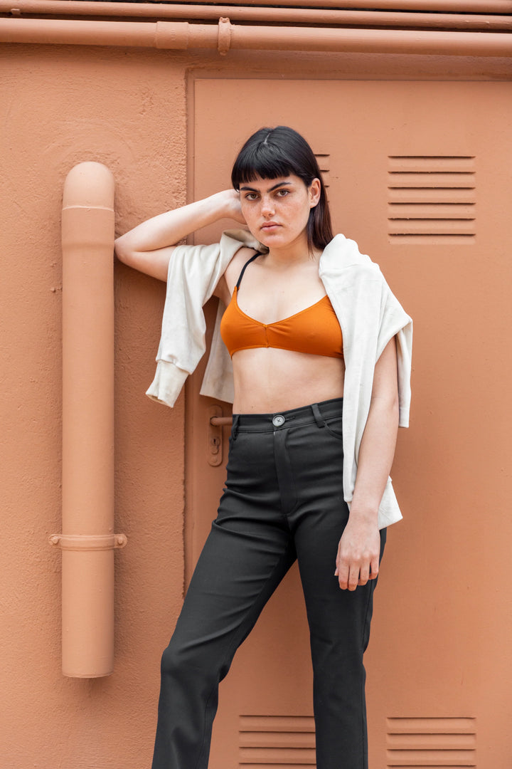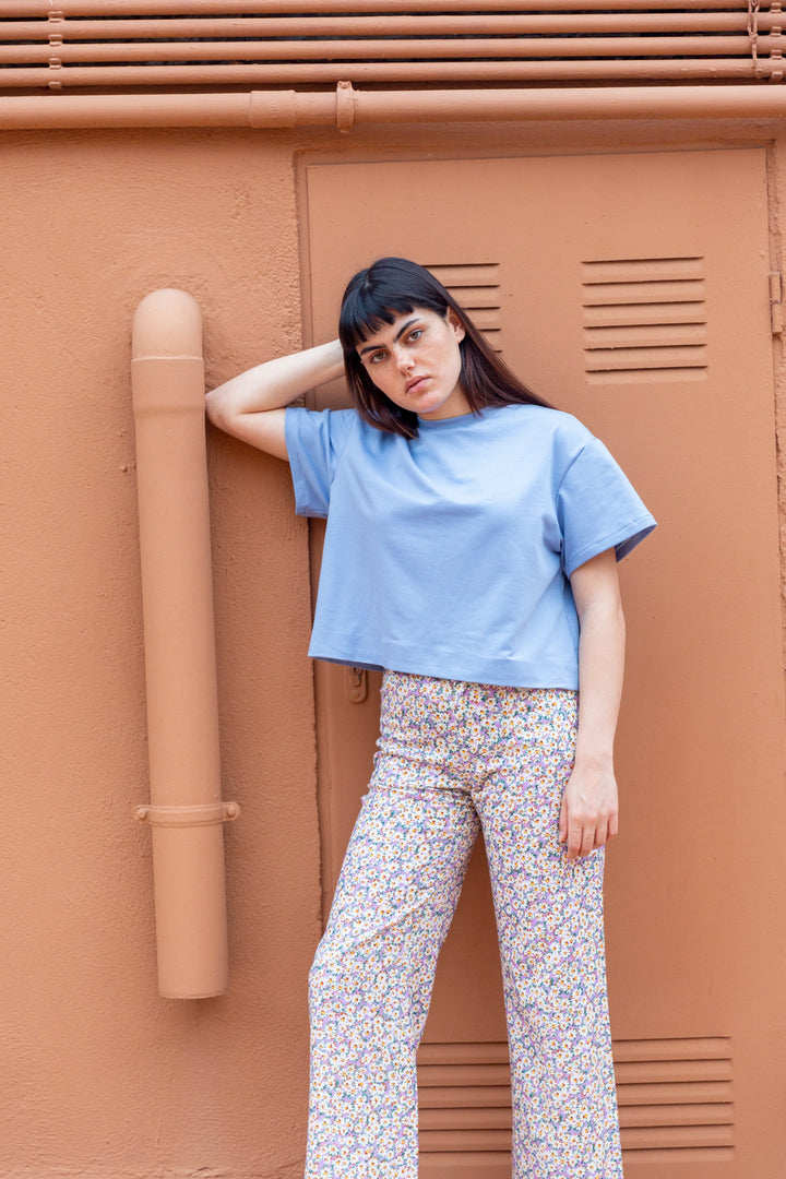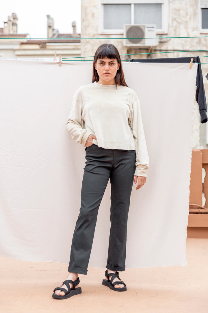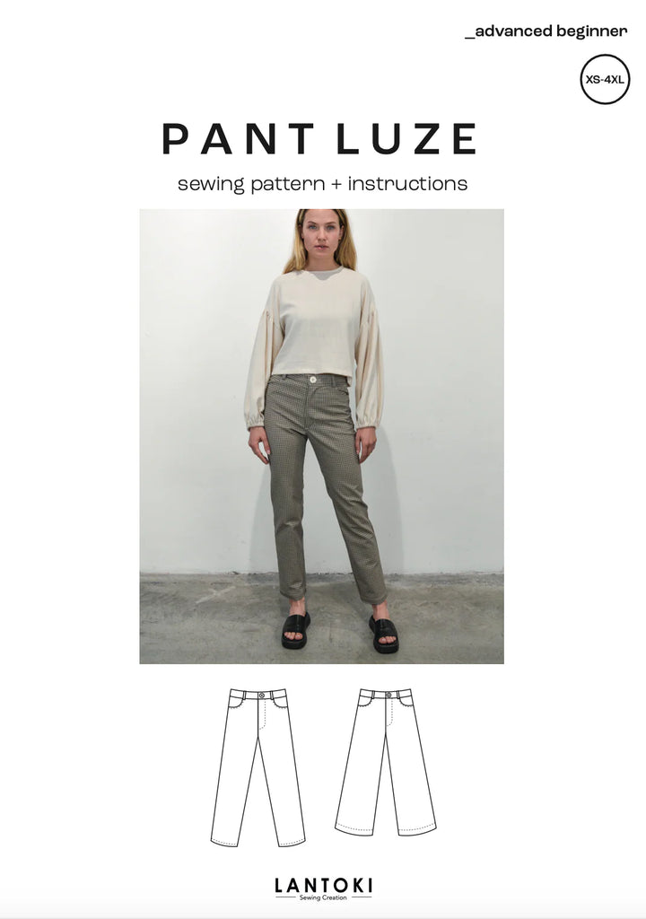 The Luze is a high-waisted jean with a straight waistband, a fly, and belt loops. It has pockets in the front and darts in the back for a better fit, as well as two patch pockets.