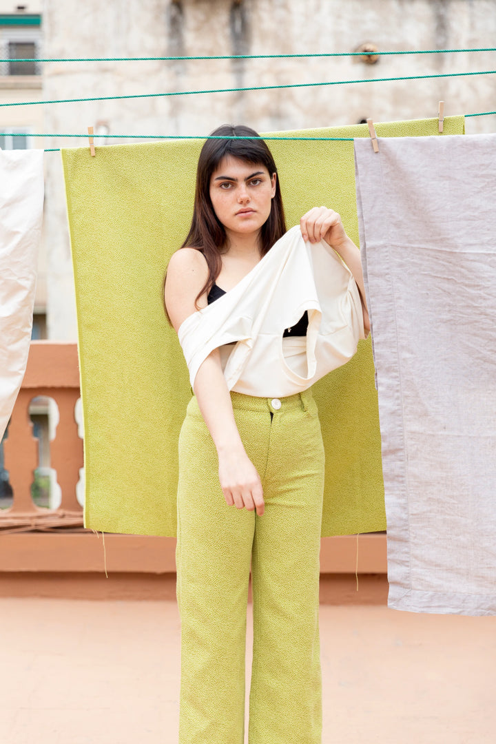To make this style, you'll need medium-weight, durable fabrics. Fabrics with 2% to 4% elastane will add comfort to the garment. Look for fabrics such as cotton canvas, medium-weight denim, heavyweight linen, fine corduroy, gabardine twill, jacquard, and similar.