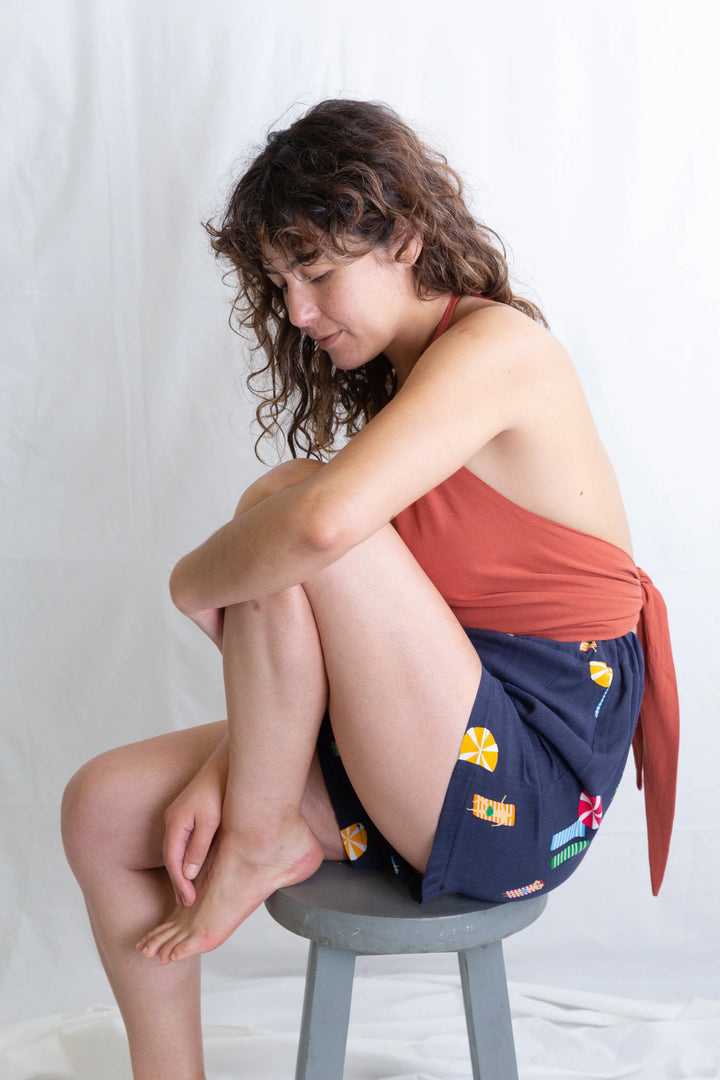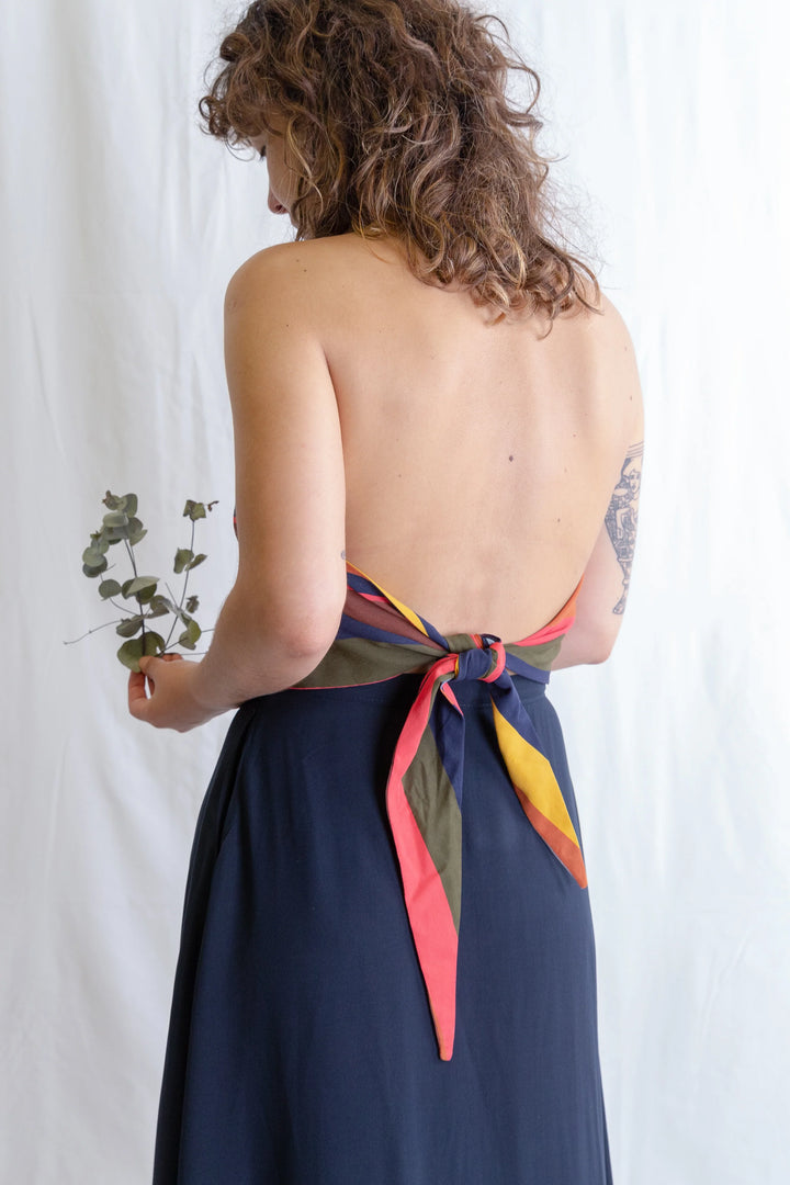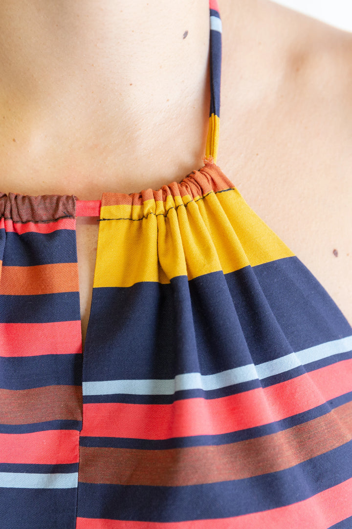 The Margarita top has a halter neckline, tied behind the neck, a small opening in the center front and the back is open and the top is tied in the back.