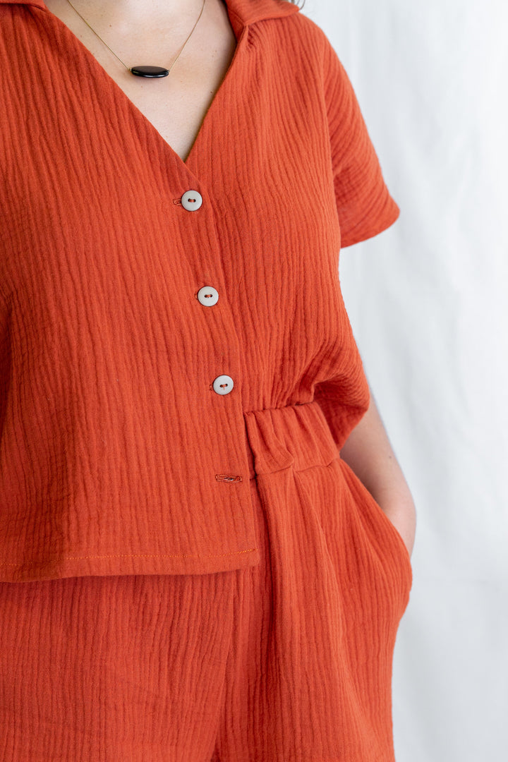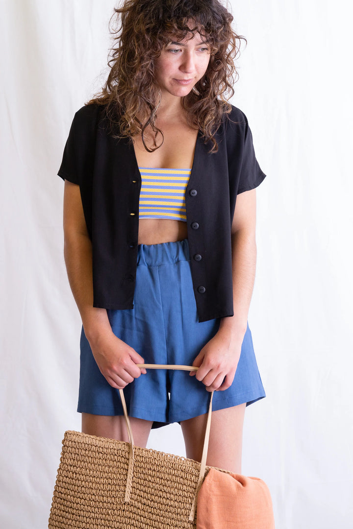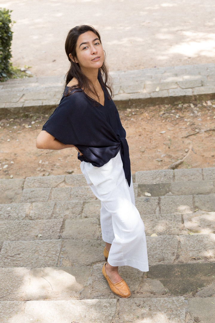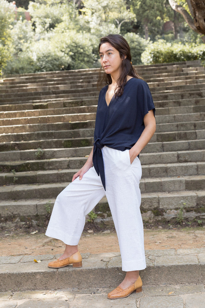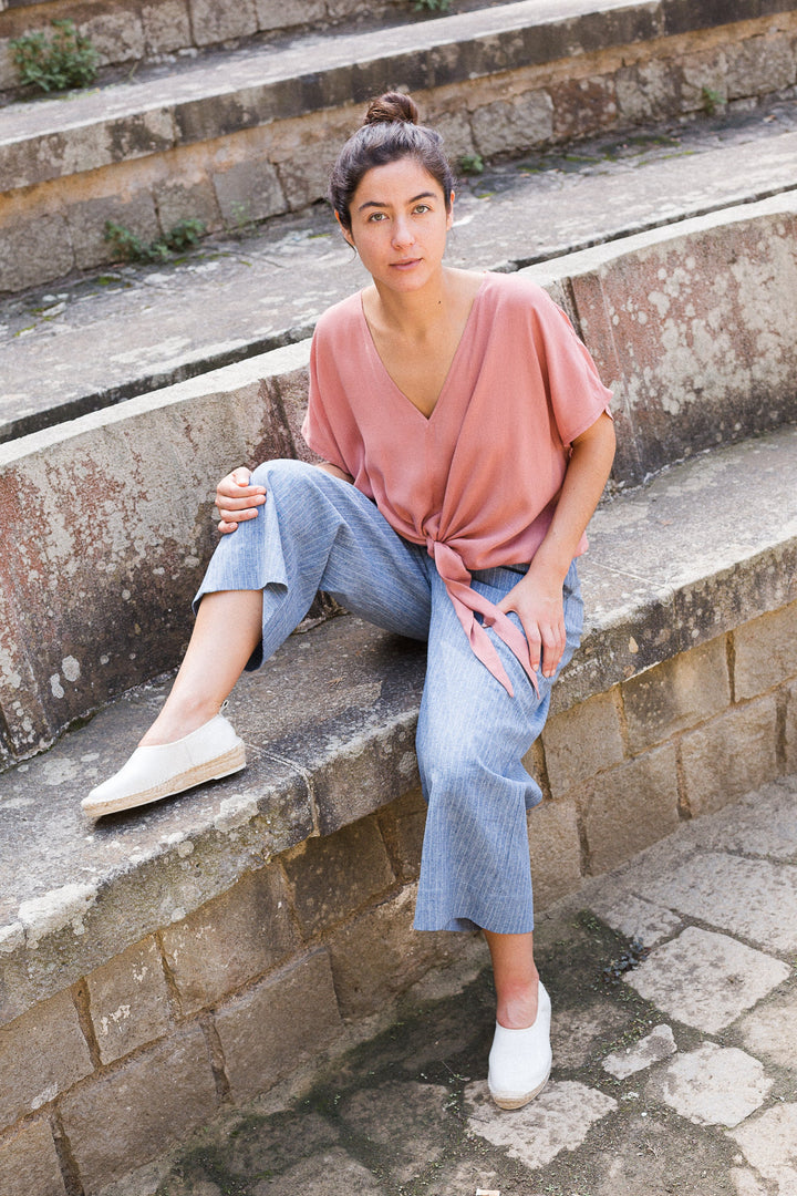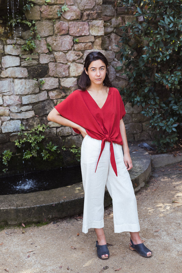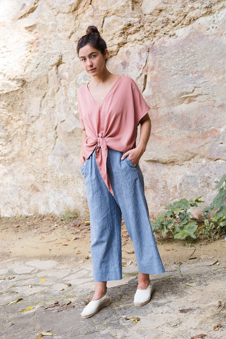 The Beti pant looks great in a wide variety of fabrics. Flowy and sheer, like viscose/rayon or Tencel/lyocell, or more structured, like linen, canvas, twill, or cotton blends, cool wool, etc.