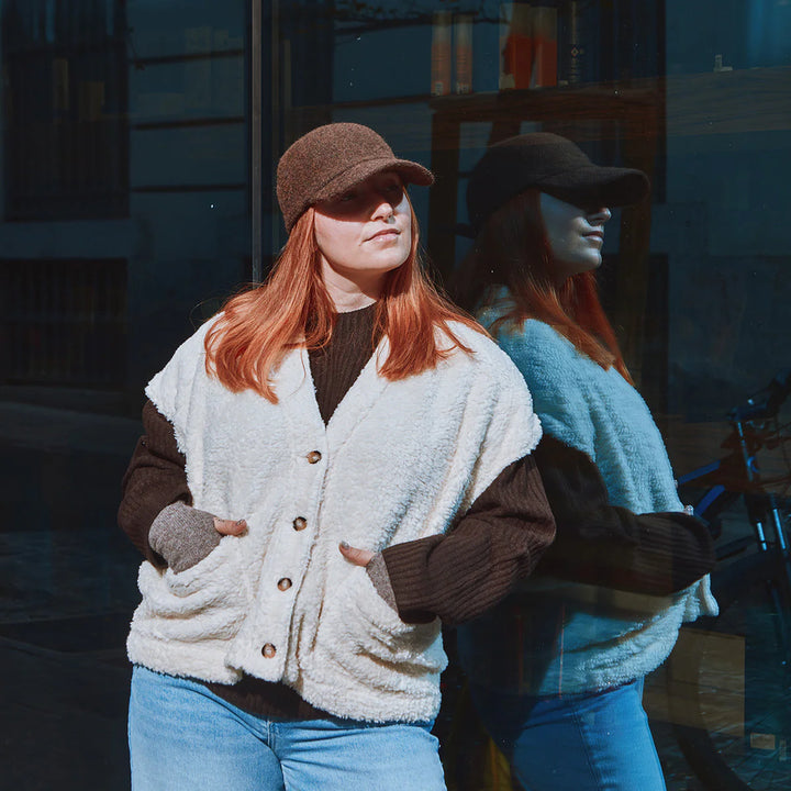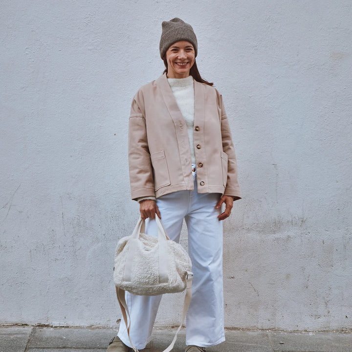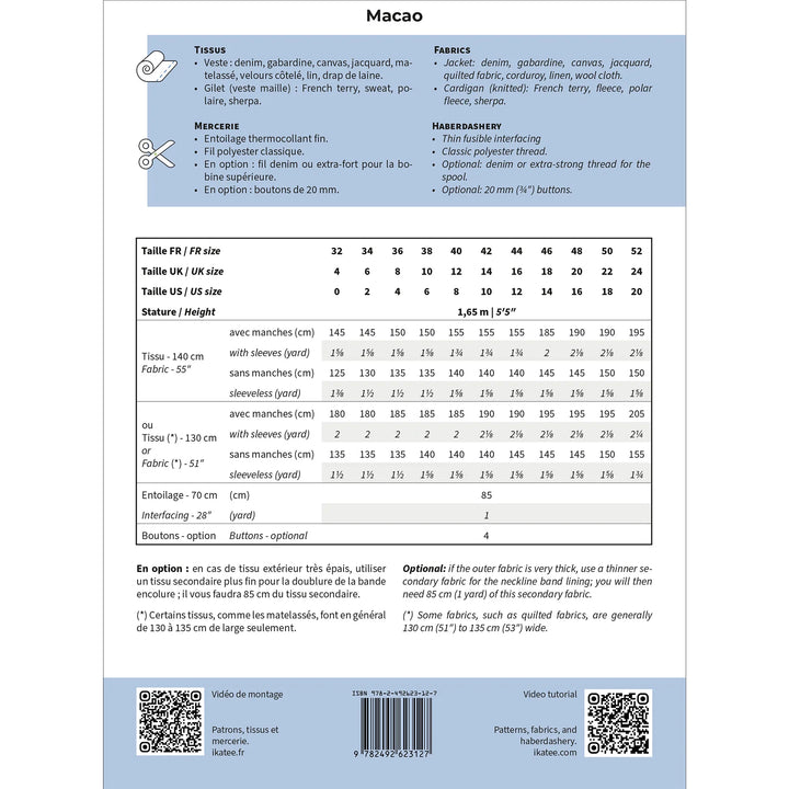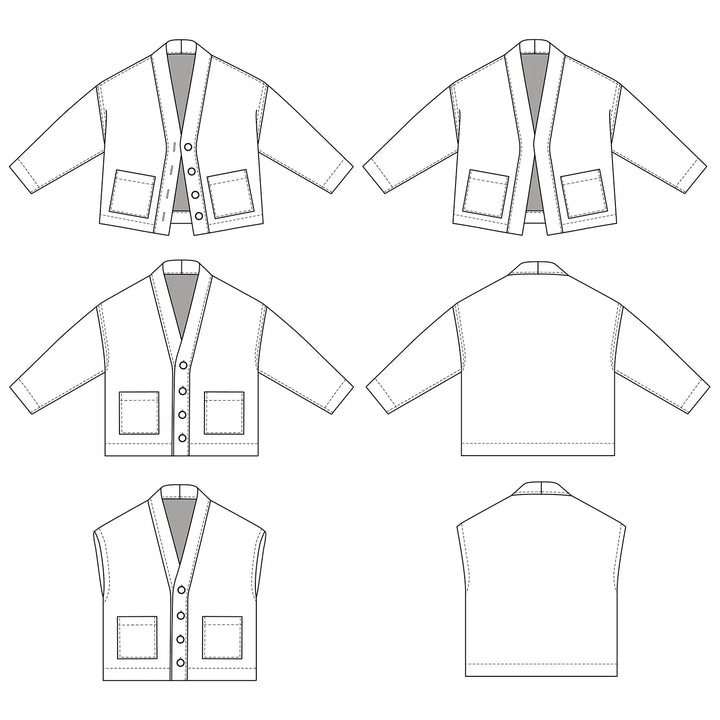 Macao est un patron de veste ou gilet au volume ample, avec les épaules descendues. Il offre une option manches longues ou sans manches. Une bande d'encolure enforme et doublée structure le vêtement. Des coutures rabattues assurent des finitions solides et impeccables.