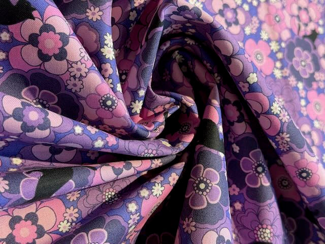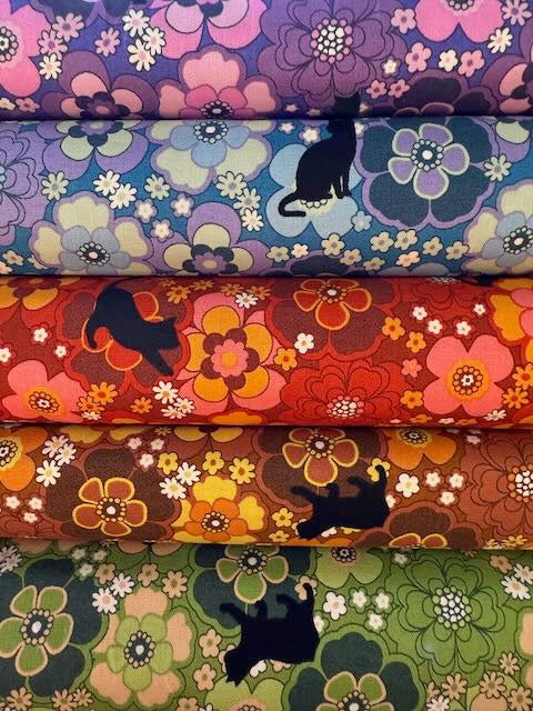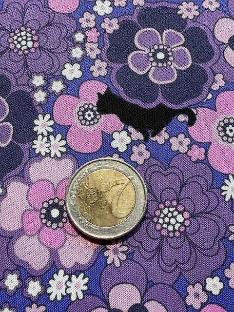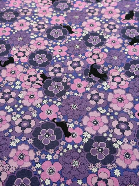 Splendide tissu 100% coton importé du Japon au motif de chats entourés de motifs de fleurs dans le style rétro vintage... on est plongés dans les années flower power!