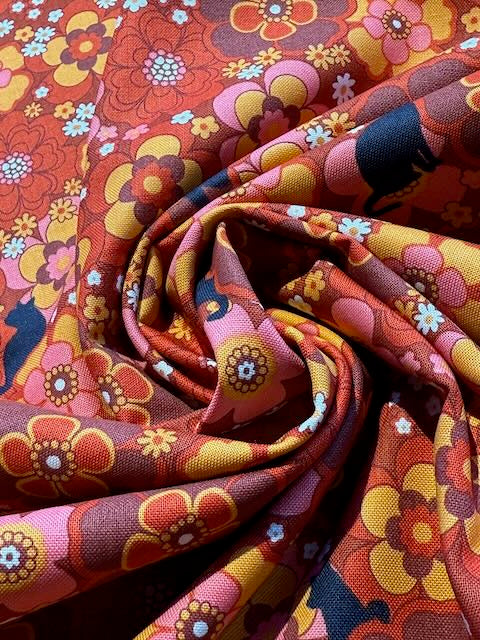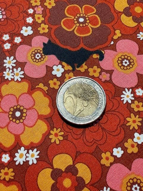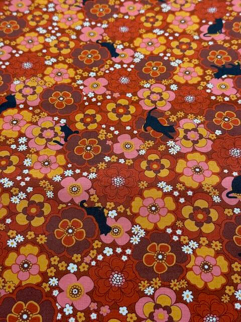 Splendide tissu 100% coton importé du Japon au motif de chats entourés de motifs de fleurs dans le style rétro vintage... on est plongés dans les années flower power!