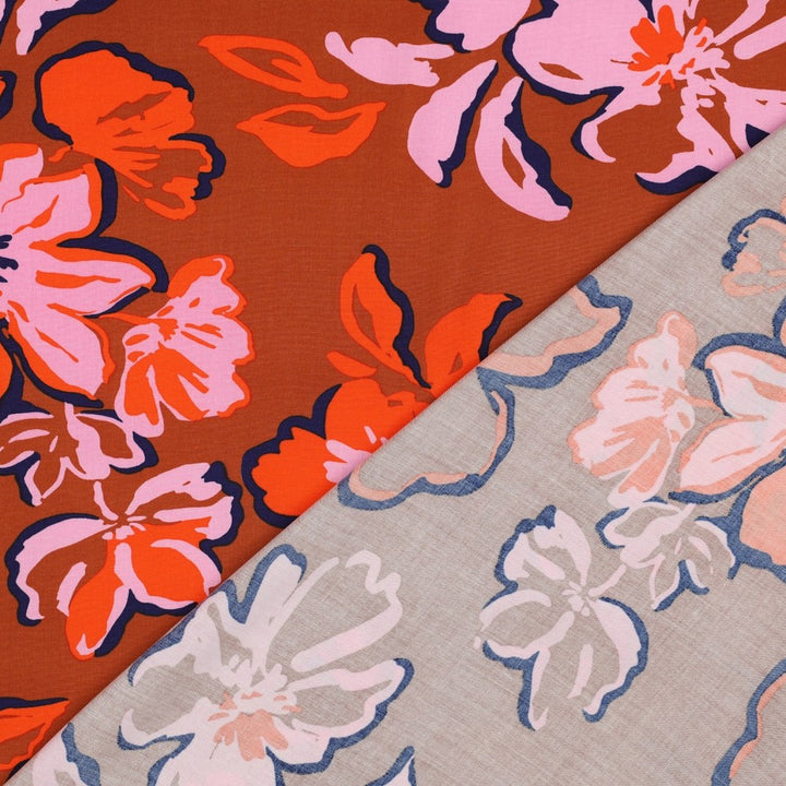 Popeline de viscose "Bouquets fleuris sur fond caramel" - certifié Eco-Vero (Prix pour 10cm)