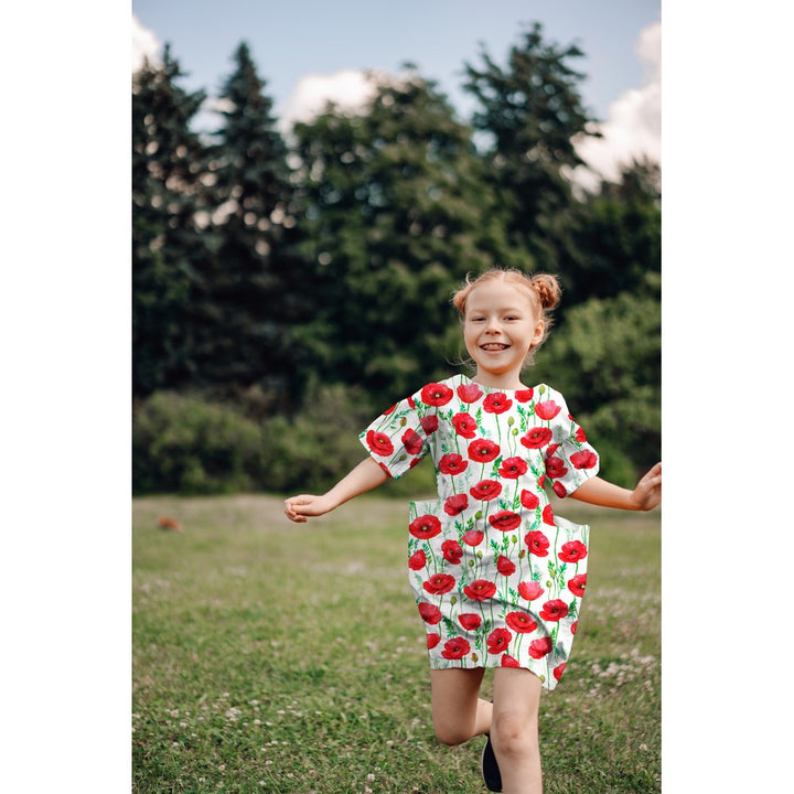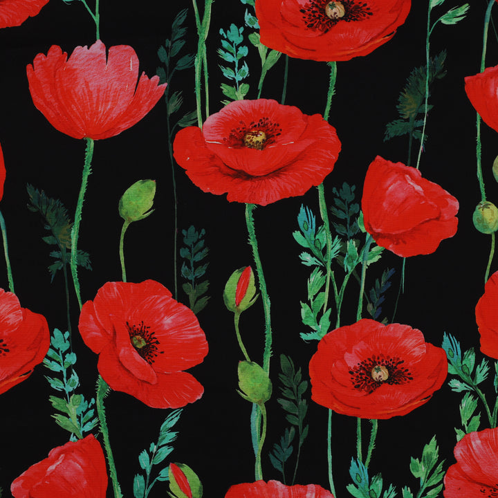 Très jolie popeline 100% coton au motif de coquelicots sur fond noir.