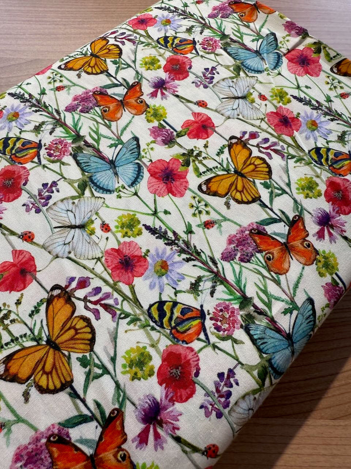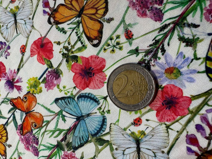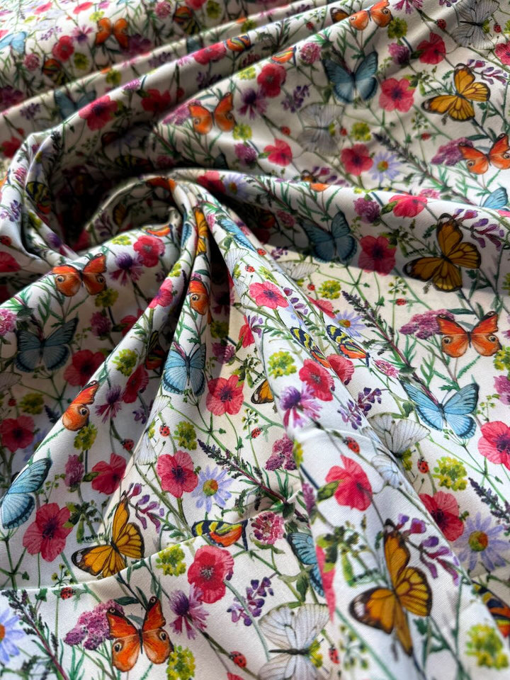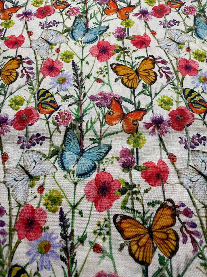 Cette popeline au motif très printaniers de papillons et fleurs sera parfaite pour vos confections d'habillement ou d'accessoires.