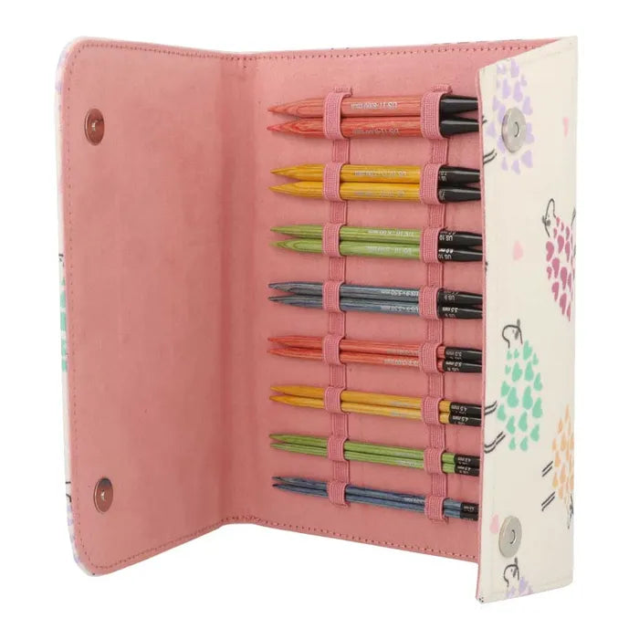 Les aiguilles interchangeables et leurs accessoires sont rangés dans un élégant étui en tissu. Cet étui comporte des pochettes intérieures pour les pointes interchangeables et une poche zippée à l'arrière pour les câbles et autres accessoires.