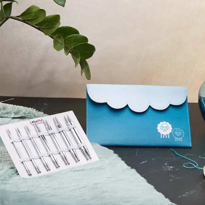 Le kit d'aiguilles interchangeables KnitPro Nova Cubics de luxe est présenté dans une jolie pochette en tissu bleu.