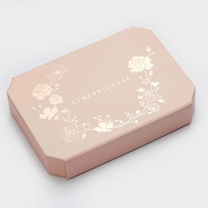 Le coffret est présenté dans une luxueuse boîte rose pâle ornée de dorures.