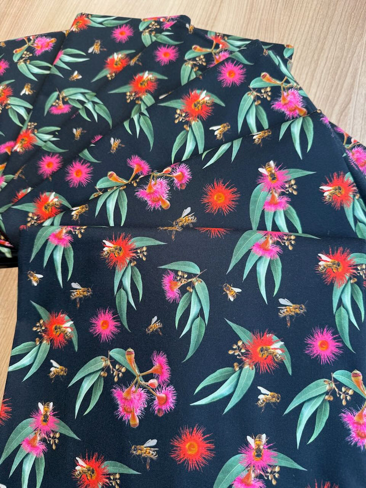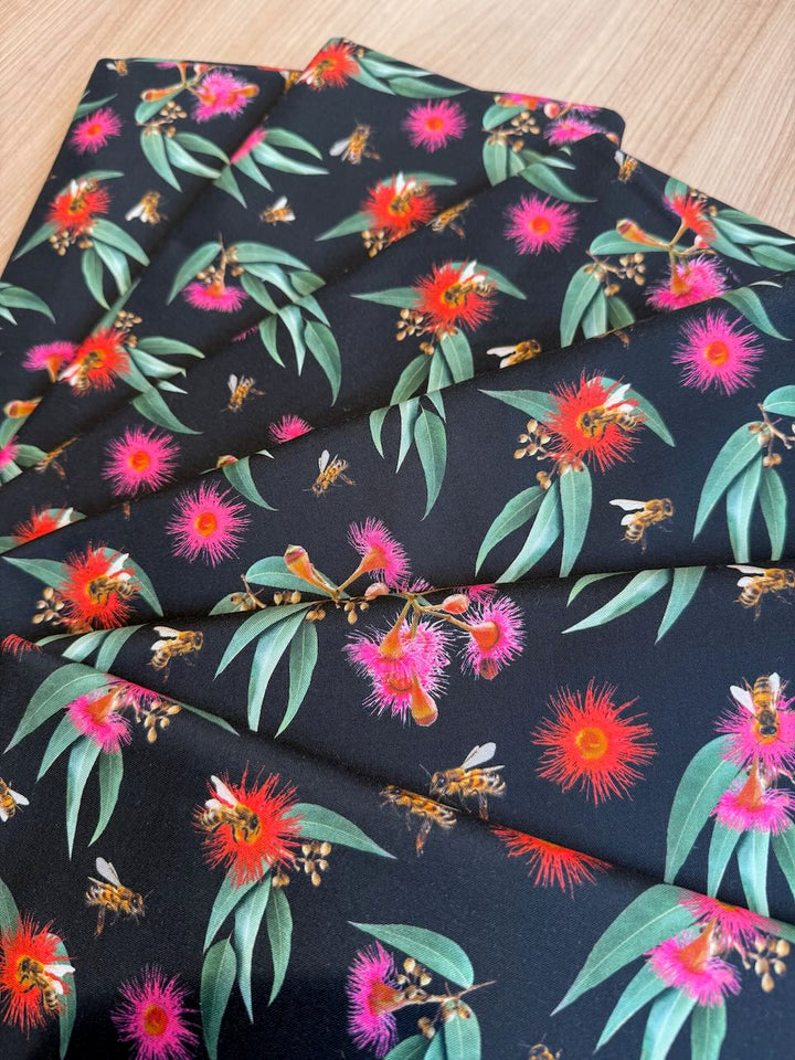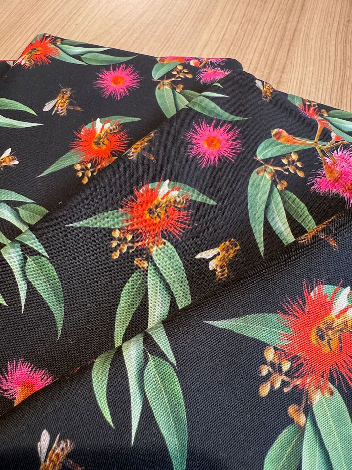 Très jolie popeline tissé fin au motif de fleurs et d'abeilles sur fond noir