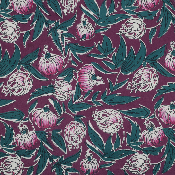 Tissu popeline 100% coton - Block-printed - Corolles aubergine (prix pour 10cm)