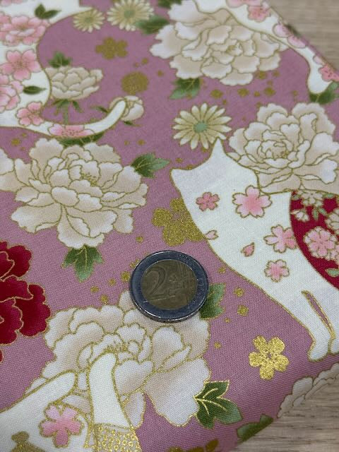 Tissus japonais "Shiroi Neko - botan " sur fond rose (prix pour 10cm)