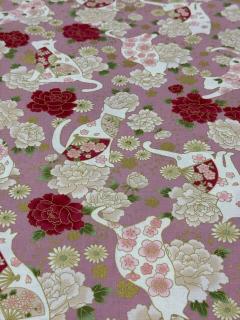 Magnifique tissu 100% coton de la marque japonaise Quiltgate. Ces tissus importé du Japon au motif de chats dans un décorum de pivoines colorées et relevés de dorures fera le bonheur des couturiers!