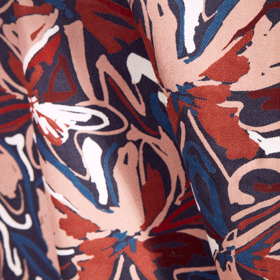 Ce motif se compose de notes florales abstraites que vous pourrez combiner avec des pièces de vestiaires couses en viscose unie ou plumetis en Rust et River.